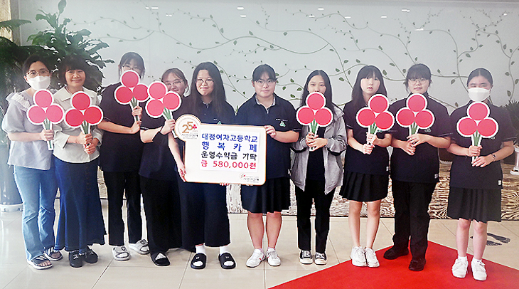 대정여자고등학교(교장 이영훈)는 지난 18일 학교 본관 비전홀에서 '대정여고 행복교실, 1학기 행복카페 운영 수익금 기부식'을 가졌다.