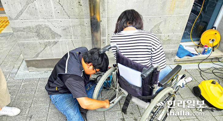 이날 서비스 현장에는 20여 명의 이동 보조기기 이용자가 방문해 타이어 공기압 점검을 비롯해 보조기기 소독 및 세척, 보조기기 이용 관련 상담 등이 진행됐다.