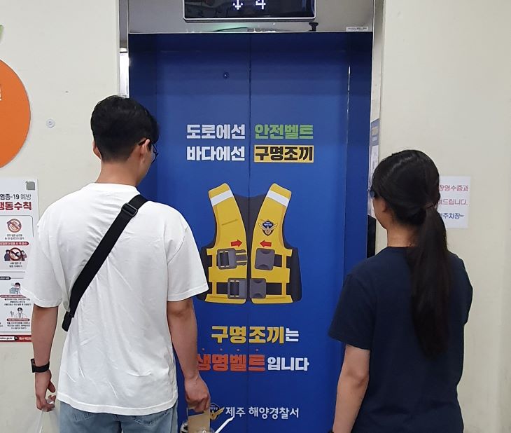 제주해양경찰서는 최근 제주시 동문시장 엘리베이터에 구명조끼 입기 홍보 일러스트와 안전 문구를 넣은 랩핑광고를 게시했다. 제주해경서 제공