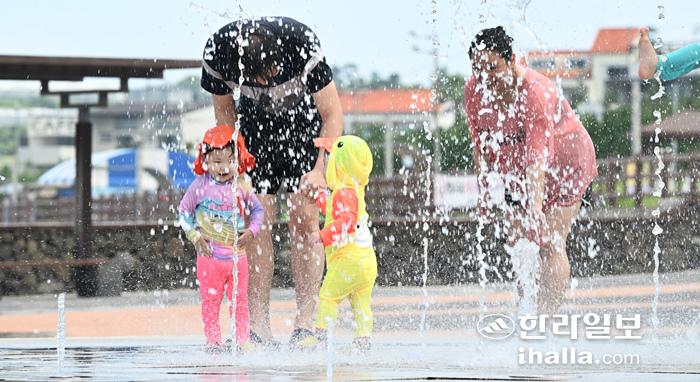 26일 제주시 곽지해수욕장을 찾은 관광객들이 분수대에서 뛰어 놀며 더위를 식히고 있다. 이상국 기자