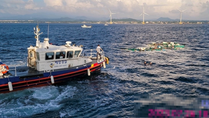 지난 26일 제주 차귀도 북서쪽 약 3.5㎞ 해상에서 해경 대원들이 해양쓰레기 수거 작업을 실시하고 있다. 제주해경서 제공