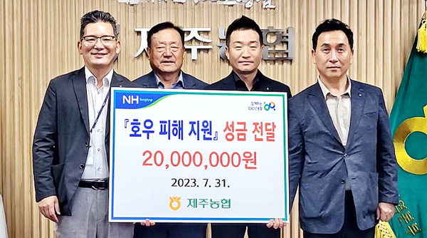 제주농협(본부장 윤재춘)은 지난달 31일 농협제주본부에서 최근 집중호우로 피해를 입은 지역의 농업인과 주민들의 신속한 피해 극복을 지원하고, '함께하는 100년 농협' 실천을 위해 성금 2000만원 전달식을 진행했다. 농협제주본부와 농협은행 제주본부, 관내 전 농·축협이 함께 마련한 이번 성금은 호우피해 지역에 전달될 예정이다. 김성범 농협중앙회 이사(중문농협 조합장)는 "하루빨리 일상으로 돌아갈 수 있게 호우 피해 복구에 도움이 되길 바란다"고 말했다.