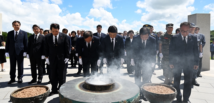 제주4·3희생자유족회와 제주도재향경우회가 2일 제주4·3평화공원에서 합동 참배하고 있다. 이상국 기자
