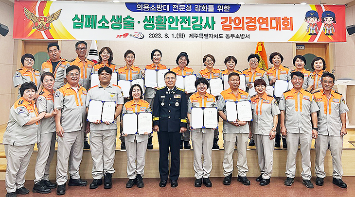 생활안전분야와 심폐소생술분야 9개팀 15명의 의용소방대원이 참가한 대회에서 김녕여성대 정숙영 부대장이 심폐소생술분야 1위, 구좌남성대 한홍일 대원이 생활안전분야 1위를 차지했다.