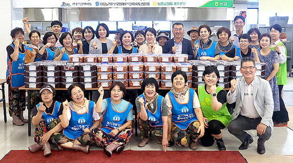 (사)농가주부모임 제주자치도연합회(회장 현효숙)와 농협 제주본부(본부장 윤재춘)는 지난 1일 서귀포농협 하나로마트에서 회원 20여명과 농협 직원이 참여해 여름김치 600㎏을 만들어 '찬찬찬(찬饌贊) 사랑의 나눔 행사'를 가졌다. 농가주부모임의 찬찬찬 사업은 홀몸 어르신과 소외계층을 위한 밑반찬 나눔을 목적으로 시작해 매년 이어오고 있는데, 이날 만든 김치는 홀로 사는 노인지원센터와 직접 전달 등 모두 200명에게 전달됐다.