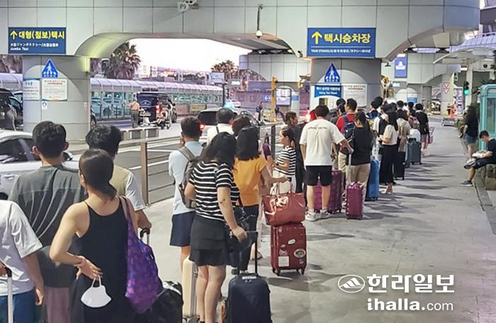 평일인 2일 저녁 제주공항 승강장에서 택시를 기다리는 관광객. 위영석 기자