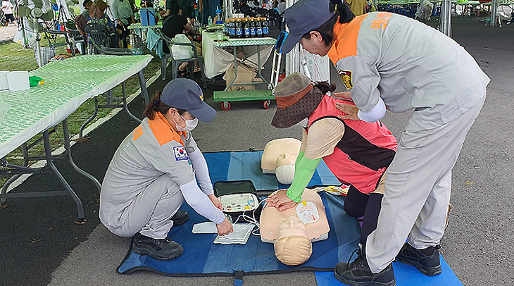 제주동부소방서 성산여성의용소방대(대장 홍재영)는 최근 열린 '제2회 조개바당축제'에서 지역주민과 관광객을 대상으로 심폐소생술과 자동제세동기(AED) 사용법을 설명하는 생활안전교육을 실시했다.