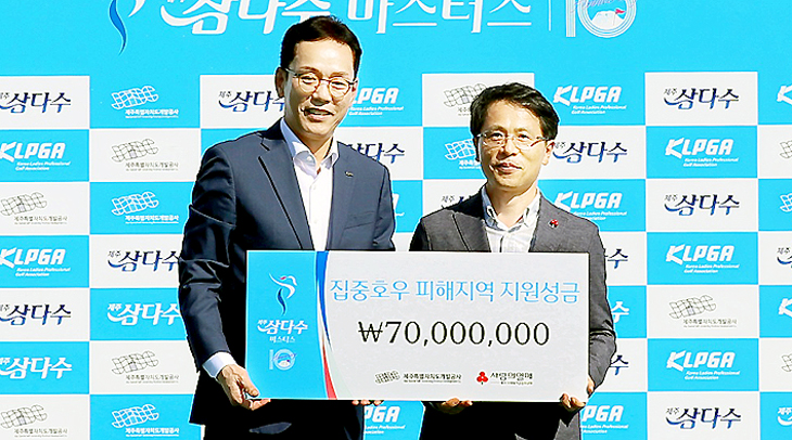 10주년을 기념해 환경·나눔·상생을 주제로 열린 제10회 제주삼다수 마스터스대회에서 주최사인 제주특별자치도개발공사(사장 백경훈)와 대회 참여 선수들이 지난 6일 블랙스톤 제주에서 진행된 대회 시상식 행사와 함께 집중호우 피해지역 지원을 위한 성금 7000만원을 사회복지공동모금회에 기탁했다.