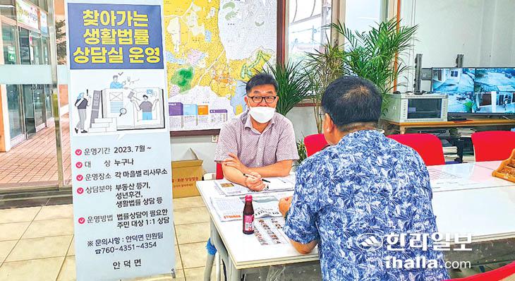 서귀포시 안덕면(면장 송창수)은 지난 9일 서광동리사무소와 동광리사무소에서 부동산 등기, 성년후견, 생활 관련 등 법률상담이 필요한 주민을 대상으로 '찾아가는 생활법률 상담실'을 운영했다.