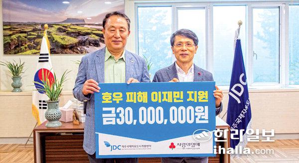 제주국제자유도시개발센터(이사장 양영철)는 지난 9일 JDC 이사장실에서 호우피해 지원을 위해 사용해 달라며 성금 3000만원을 제주사회복지공동모금회(회장 강지언)에 기탁했다.