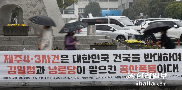 지난 3월 21일 제주시청 조형물 앞에 게시된 제주4·3 왜곡 현수막. 한라일보 자료사진