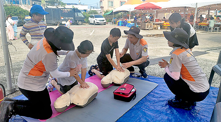제주소방서 외도119센터 의용소방대(대장 김동주·김정미)는 최근 도두오래물 광장에서 열린 오래물축제에서 지역주민과 방문객들을 대상으로 물놀이 사고 예방법, 심폐소생술 교육, 제세동기 사용법 등 소방안전체험장을 운영했다.
