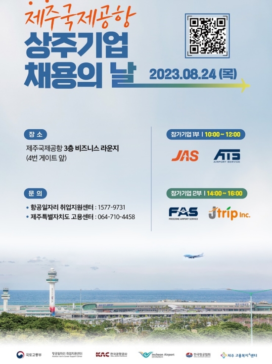 한국공항공사는 24일 제주국제공항 3층 비즈니스 라운지에서 '제주공항 상주기업 채용의 날' 행사를 개최해 36명을 채용한다고 22일 밝혔다. 행사는 국토교통부, 제주특별자치도 고용센터, 인천국제공항공사, 한국항공협회가 공동 주최해 제주공항 상주기업과 구직자를 매칭해 현장에서 면접과 채용이 이뤄질 수 있도록 지원한다.