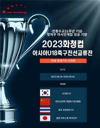 [한라일보] 제주와 중국 태국 일본 등 아시아 4개국이 참가하는 2023화청컵 U-18 아시아 축구 친선교류전이 29일부터 9월2일까지 서귀포시 효돈축구장에서 열린다.