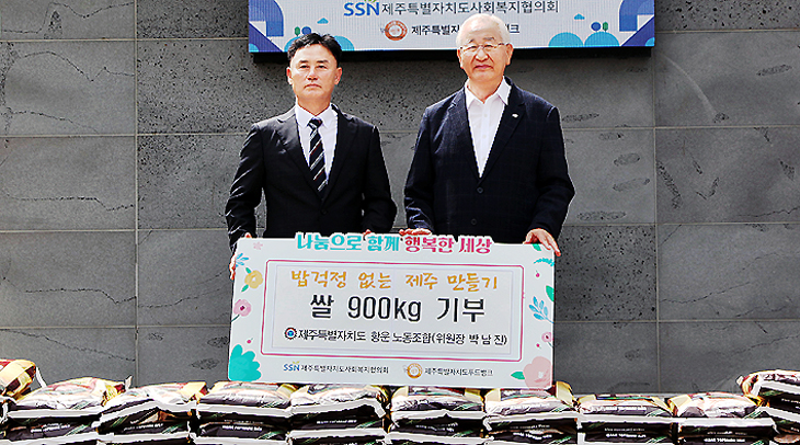 제주특별자치도항운노동조합(위원장 박남진)은 지난 28일 제주특별자치도 사회복지협의회를 방문해 '2023년 밥걱정 없는 제주 만들기' 행사에 동참해 쌀 900㎏(200만원 상당)을 전달했다.