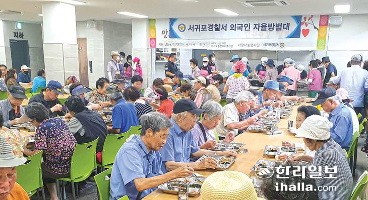 서귀포경찰서(서장 오충익)는 지난 1일 서귀포시노인복지회관에서 외국인자율방범대 및 자율방범대 연합회와 합동으로 지역 내 만 60세 이상의 취약계층 어르신 250여 명을 대상으로 무료급식 봉사활동을 전개했다.