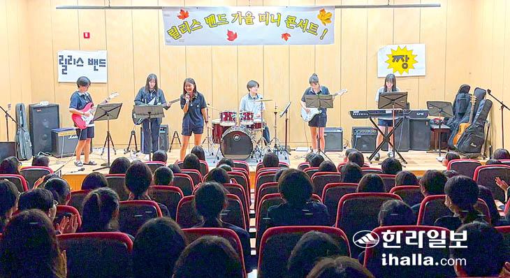 제주중앙여자중학교(교장 서희순)는 지난달 31일부터 이달 14일까지 학생 자율동아리 '릴리스밴드'의 가을 미니 콘서트를 이어가고 있다.