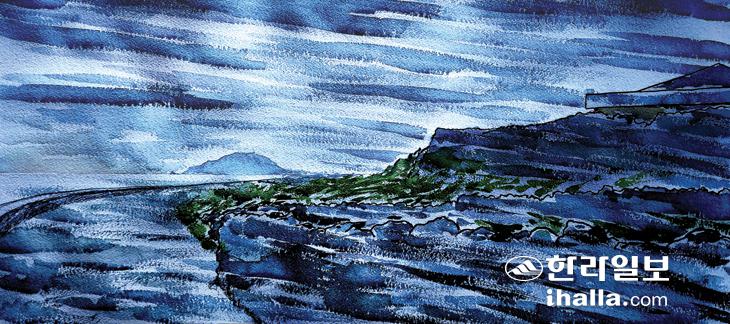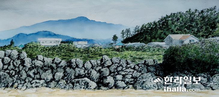 그리는 도중에 생각하였다. 저 백록담도 이 앞에 돌담 크기만 하구나! 아무리 커도 멀리 있으면 작아지는 것. 이를 어찌 원근법의 이치로만 생각할 것인가. 아주 작은 것도 가까이 두면 크게 느껴지는 마음을 그리려 하였다. 오후 5시의 태양 아래 멀리 한라산 능선에는 구름이 끼어 있고, 오전에 비가 와서 그런가 아직도 대기는 습도가 있어 안개구름이 은은하다. 마치 동양화의 산을 연상시키는 장면이라 실질적인 거리를 느낄 수 있어서 좋았다. 특징적인 관찰이 있다면 돌담의 석질이 너무도 다양하다는 것이다. 하여, 마을에 중장비 일을 하시는 분의 고견을 청취하였다. 아니나 다를까. 마을 안에 밭이나 들을 파서 암반들을 보면 너무도 다양한 모습이라고 한다. 널개 오름이 솟아나며 출렁거렸을 땅과 용암을 떠올리는 즐거움을 아이러니 하게도 이 그림 속에서 발견하려 하고 있다. 집들의 평화로운 배치를 즐거운 마음으로 그릴 수 있어서 행복.