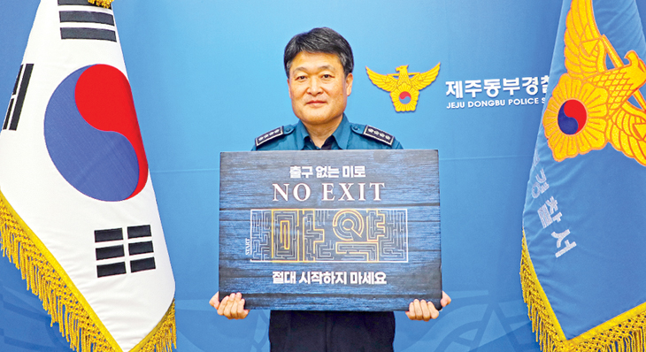 박현규 제주동부경찰서장은 지난 6일 박기남 제주자치경찰단장의 추천을 받아 마약범죄 중독 위험성을 알리는 '노 엑시트(NO EXIT)' 릴레이 캠페인에 동참했다. 노 엑시트 릴레이 캠페인은 '출구없는 미로 NO EXIT 마약 절대 시작하지 마세요'라는 문구가 담긴 캠페인 인증사진을 찍어 SNS에 게시하고 다음 참여자로 2명을 지목하는 방식으로 진행된다.