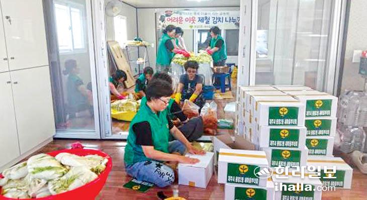 제주시 용담2동(동장 황태훈)과 용담2동새마을부녀회(회장 윤미경)는 지난 9일 부녀회 사무실에서 회원 10여명이 참석한 가운데 제철김치를 만들어 어려운 이웃 40가구에 전달했다.