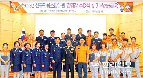 제주서부소방서(서장 고정배)는 지난 11일 대회의실에서 2023년 하반기 신규 의용소방대원에게 임명장 수여 및 교육훈련을 실시했다.