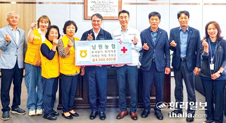 남원농협(조합장 고일학)은 지난 12일 남원농협 조합장실에서 대한적십자사제주특별자치도지사(회장 정태근)에 추석맞이 취약계층 차례상 장보기 후원금 400만원을 전달했다.