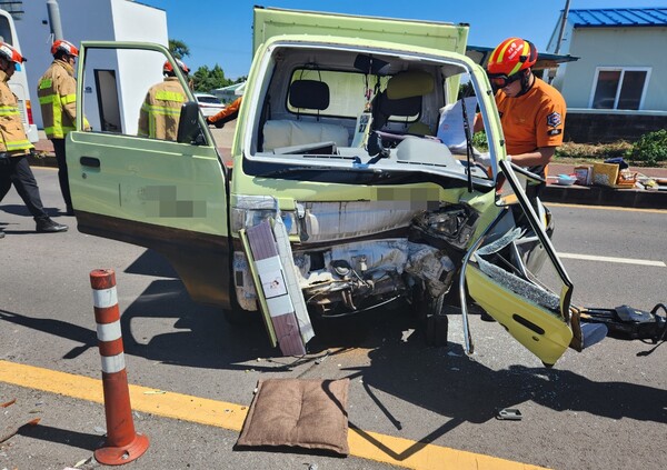 [한라일보] 15일 낮 12시40분쯤 서귀포시 온평리 상동교차로에서 70대 남성 A씨가 몰던 소형 트럭이 중앙 가드레일을 들이받았다.