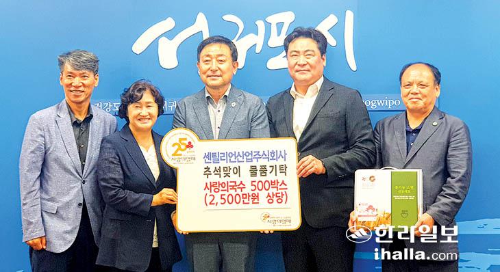 서귀포시는 (주)센틸리언산업(대표 문준수)과 지난 20일 서귀포시청에서 이웃 돕기 물품 기탁식을 가졌다. 센틸리언산업에서 기부한 사랑의 국수 500박스(2500만 원 상당)는 사회복지공동모금회를 통해 경로당 3곳에 지원할 예정이다.