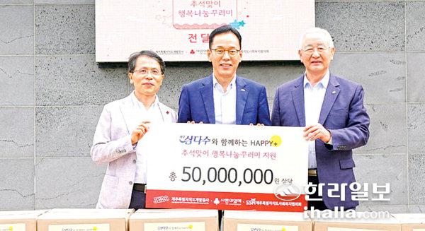 제주특별자치도개발공사는 21일 제주사회복지협의회 앞마당에서 '2023년 추석맞이 행복 나눔 꾸러미 전달식'을 개최했다.