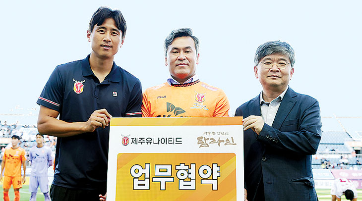 K리그1 제주유나이티드와 축산물 유통업체인 영농조합법인 탐라인은 지난 1일 제주월드컵경기장에서 업무협약을 체결했다.