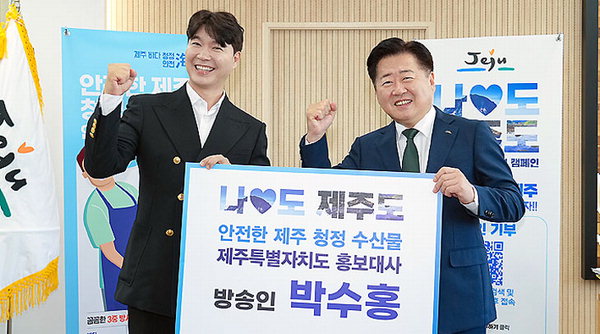 오영훈 도지사는 이날 박수홍 씨에게 제주 홍보대사 위촉패를 전달하며 제주 청정 수산물과 고향사랑기부제도를 국내외에 널리 알려줄 것을 당부했다.