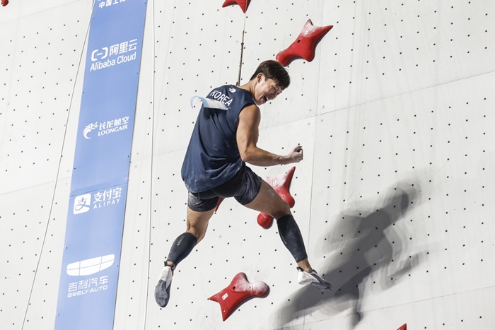 2022항저우 아시안게임 스포츠클라이밍 스피드릴레이에서 동메달을 획득한 이용수 선수의 경기 장면. 대한산악연맹 제공