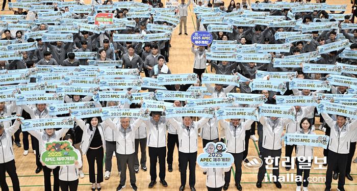 5일 제주복합체육관에서 열린 제104회 전국체전 제주선수단 결단식에서 참가자들이 2025APEC정상회의 유치 퍼포먼스를 진행하고 있다. 이상국 기자
