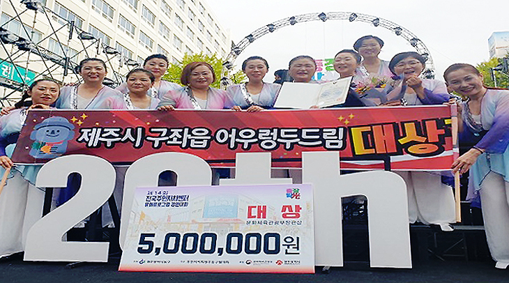 제주시 구좌읍 '어우렁 두드림' 모듬북 팀이 제14회 전국 주민자치센터 문화프로그램 경연대회에서 영예의 대상을 차지해 문화체육관광부 장관상을 수상했다.