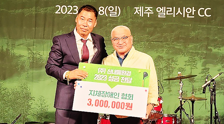산내들환경(회장 화상근)이 주관하는 '제2회 산내들환경 회장배 친선골프 대회'에서 제주특별자치도지체장애인협회 제주시지회(지회장 오형범)에게 지난 8일 후원금 300만원을 전달했다.