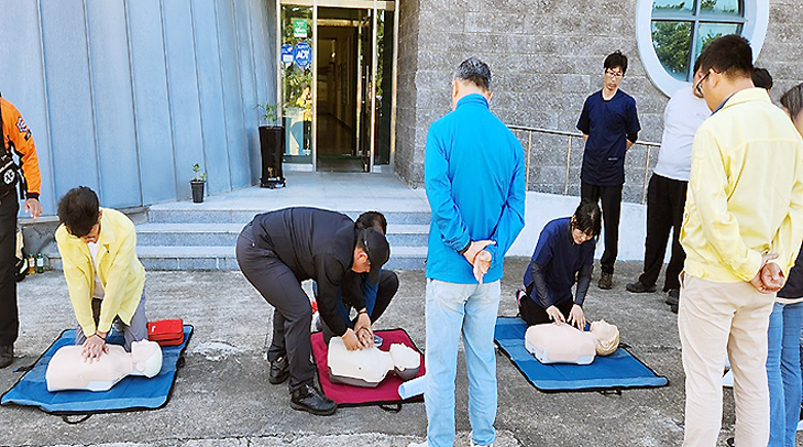 동부소방서 구좌119센터(센터장 고인수)는 지난 12일 제주해양수산연구원 수산종묘연구센터 직원들을 대상으로 합동훈련을 실시했다. 이날 직원 20여명을 대상으로 화재진압, 소화기 사용법, 심폐소생술 교육을 진행했다.