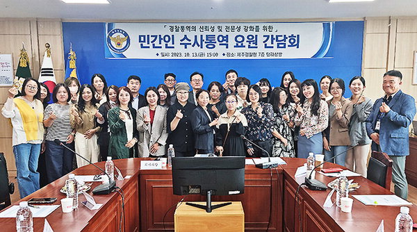 제주경찰청(청장 이상률)은 지난 13일 제주경찰청 5층 한라상방에서 경찰 수사에 참여하는 민간인 통역요원들을 대상으로 간담회를 개최했다. 이날 간담회에서는 관내 체류 외국인 증가에 따른 치안수요 증가와 원활하고 신속한 통역 지원방안을 모색하는 시간이 마련됐다. 또 통역요원을 대상으로 수사절차 및 용어, 통역 시 준수사항 등에 대해 교육하고 현장 의견을 청취했다.