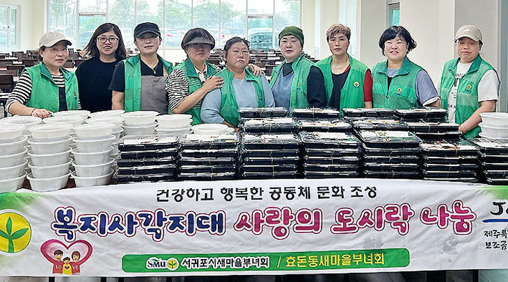 서귀포시 효돈동새마을부녀회(회장 오은실)는 지난 13일 복지 사각지대에 있는 취약계층 100여 명에게 사랑의 도시락 나눔 행사를 진행했다.