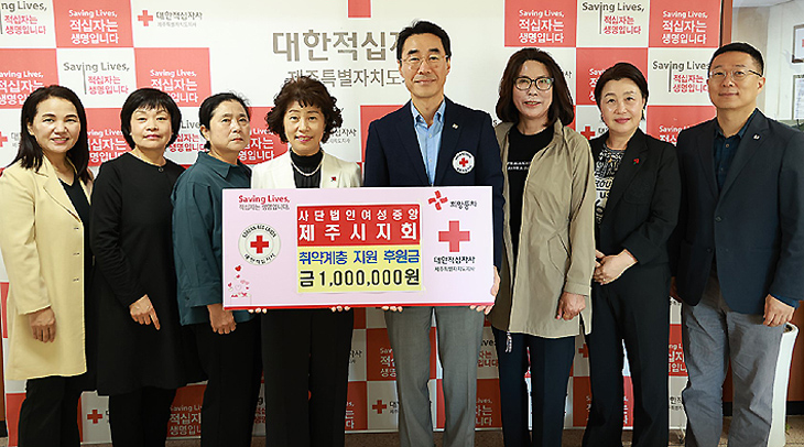 사단법인 여성중앙제주시지회(회장 김경애)는 지난 17일 제주적십자사 회장실에서 대한적십자사제주특별자치도지사(회장 정태근)에 취약계층지원 성금 100만원을 전달했다.