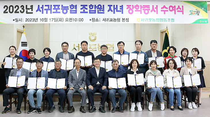 서귀포농협(조합장 정기철)은 지난 17일 서귀포농협 본점에서 조합장·상임이사·장학생 등 30여명이 참석한 가운데 '2023년도 서귀포농협 조합원 자녀 장학증서 수여식'을 진행했다.