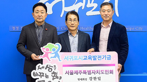 재단법인서귀포시교육발전기금(이사장 현봉식)은 교육 기부를 통해 더 나은 미래를 여는 사회지도자들의 모임인 '교육누리' 1호 회원으로 지난 23일 강한일 서울제주특별자치도민회 명예회장을 선정했다. 강한일 명예회장은 2012년 2000만원에 이어 이날 3000만원을 서귀포시교육발전기금으로 기탁했다.