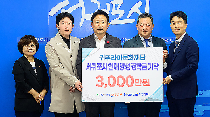 서귀포시는 지난 24일 서귀포시청에서 귀뚜라미문화재단(회장 최진민)과 지역 인재 장학금(3000만 원) 기탁식을 가졌다. 귀뚜라미 장학금은 지난 1985년부터 이어진 귀뚜라미그룹의 대표적인 사회 공헌 사업이다.