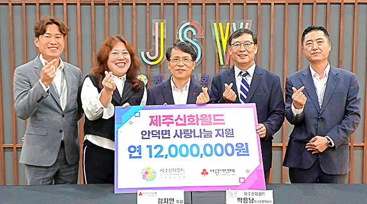 제주신화월드(COO-최고운영책임자 박용남)는 지난 25일 로비에서 '안덕면 사랑나눔 지원' 성금 전달식을 갖고 매년 안덕면 어려운 이웃돕기 성금 1200만원을 제주사회복지공동모금회(회장 강지언)에 기부하기로 약속했다.
