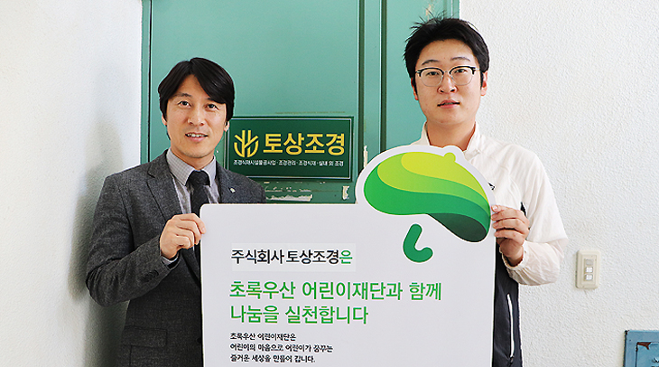 서귀포시 동홍동에 위치한 주식회사 토상조경(대표 박진양)은 지난 27일 초록우산 제주후원회(회장 황금신)와 제주지역본부(본부장 변정근)가 진행하는 나눔릴레이 캠페인에 동참하고 도내 아동들을 돕기 위한 후원에 동참하는 약속으로 나눔현판 전달식을 진행했다.