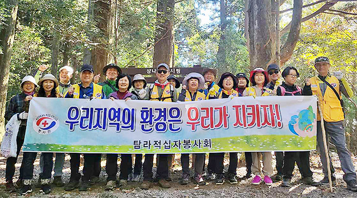 탐라적십자봉사회(회장 고경식)는 지난 29일 서귀포시 남원읍 한남리 사려니오름 주변에서 '우리지역 환경은 우리가 지키자!'는 슬로건 아래 둘레길 환경정화 활동을 진행했다.
