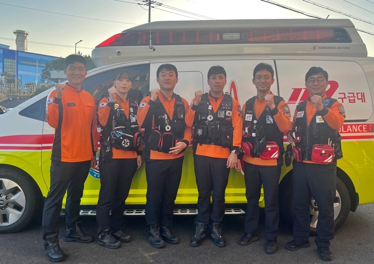 호흡 곤란을 호소하다 갑자기 의식을 잃은 A씨의 구급 활동에 투입됐던 한림119센터 구급대원들. 사진 왼쪽부터 이영생 소방사, 장지혜 소방사, 김기환 소방사, 양태성 소방교, 좌승훈 소방장, 강희준 소방위.