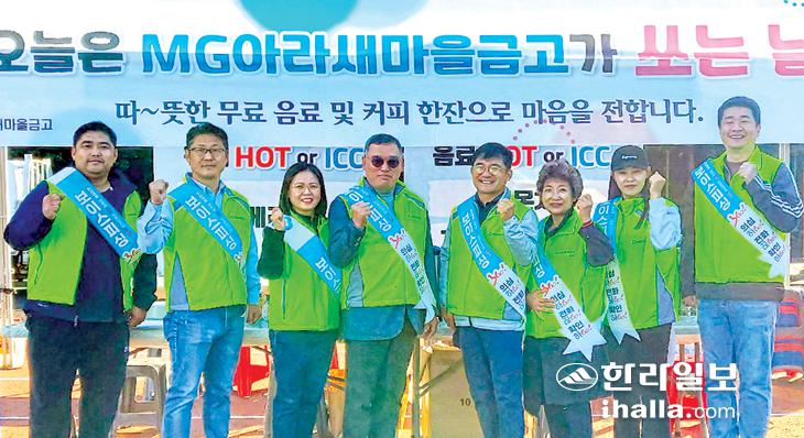 아라새마을금고(이사장 전재구)는 지난달 29일 제주중앙고등학교 운동장에서 열린 제21회 아라동민체육대회에 참석한 지역 주민을 대상으로 무료 커피·음료 제공과 함께 전기통신금융사기 피해 예방 및 대포통장 근절 캠페인을 벌였다.