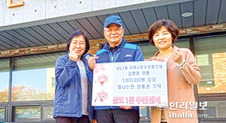 제주시 삼도1동지역사회보장협의체 강영종 위원은 지난달 31일 삼도1동(동장 송정심) 관내 어려운 이웃을 위해 탐나는전 상품권 100만원을 기탁했다. 이는 관내 저소득가구 등 복지 취약가정에 전달될 예정이다.