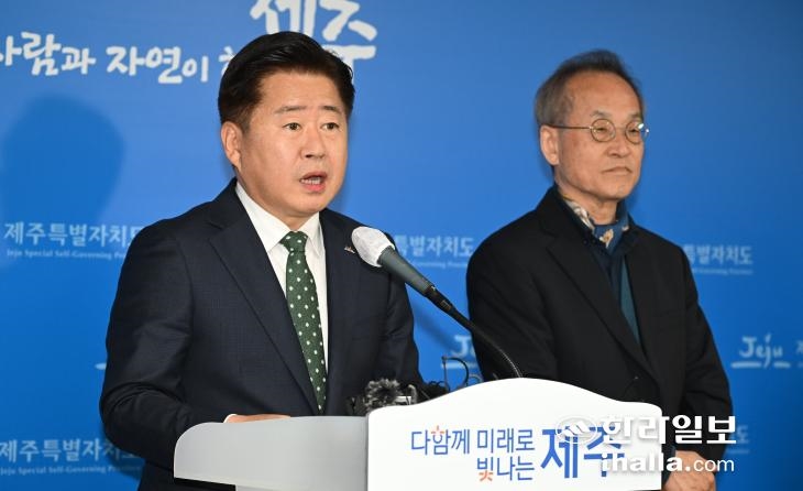 오영훈 제주도지사와 최재천 이화여대 석좌교수가 제주도청 기자실에서 생태법인 도입을 위한 제주특별법 개정 추진하겠다고 밝히고 있다. 한라일보 자료사진