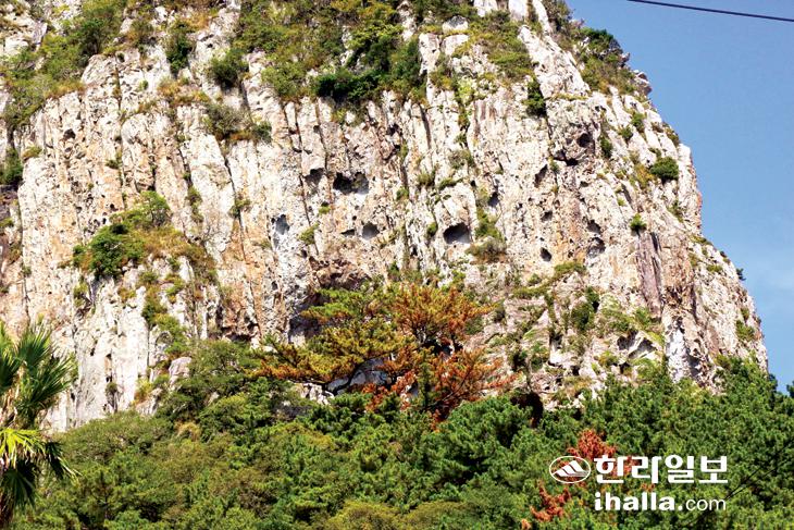 절벽에 수많은 풍화혈이 발달했다. 산방굴사는 그중 최대다.